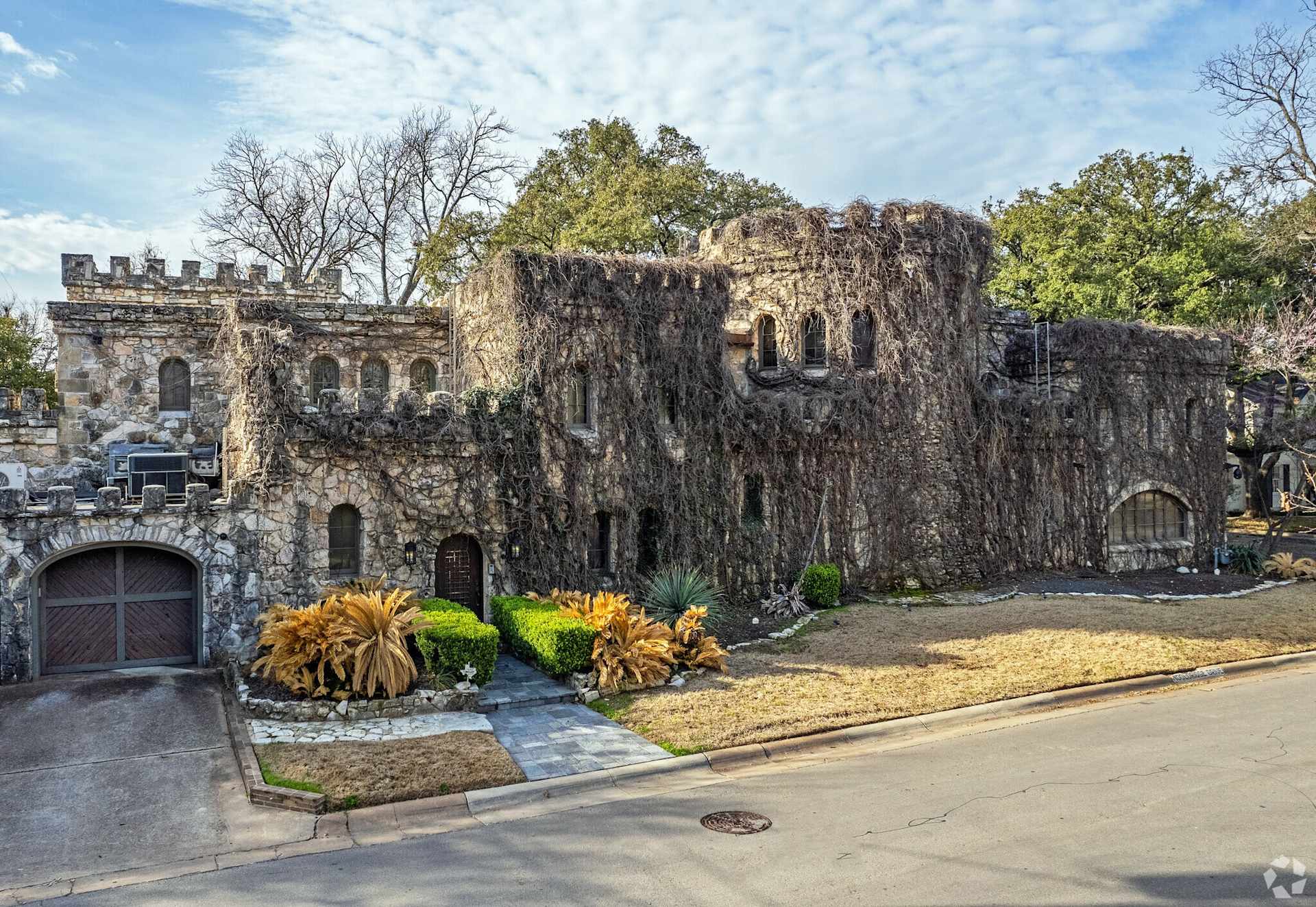 This residence is located at 1301 West 29th Street. It is situated on a cliff that has stunning views of UT and the downtown Austin skyline. The home was built in 1939 by Herbert Bohn. It features a very distinctive and unique Art Moderne style. Bohn and his wife were big fans of the sci-fil film Lost Horizon and designed their home to resemble the castle in the film. In order to make their home look like the castle, they incorporated porthole windows, round balconies with ship railings, a round magic door, speed lines, and a cantilevered top floor.